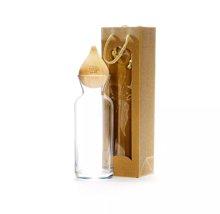 Der Zirm Drop (Ø 72 mm) aus echtem Zirbenholz dient als natürlicher Verschluss und verleiht der Karaffe einen einzigartigen Charakter.