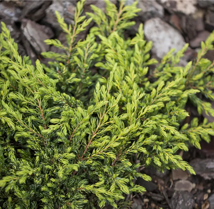 Der Gemeine Wacholder 'Goldschatz' beeindruckt mit seinem gelben Austrieb, der sich im Sommer zu einem schönen Blau-Grün bis Grün verfärbt. Seine Nadeln machen ihn zu einem attraktiven Anblick. Besonders auffällig sind seine schwarz-braunen Zapfen, die ab September ausgereift sind.