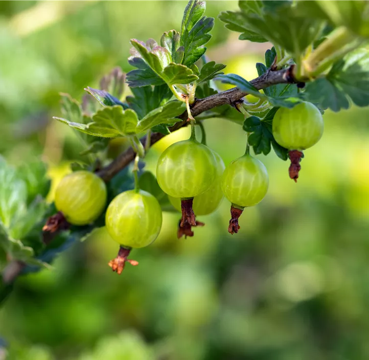 Im Juli ist Erntezeit: Die Stachelbeere 'Mucurines' (Ribes uva-crispa) ist reif und du kannst direkt in deinem eigenen Garten ernten! Ihre großen, ovalen, hellgrünen Beeren haben ein festes, durchscheinendes Fleisch mit süßem Geschmack. Du kannst sie roh verzehren, sie lassen sich aber auch zu vielen Köstlichkeiten, wie zum Beispiel Süßspeisen, verarbeiten. Auch leckere Konfitüren können daraus zubereitet werden. Doch ohne ihre weißen Blüten gibt es auch bei der Stachelbeere 'Mucurines' keine Früchte. Ihre Blütezeit liegt zwischen April und Mai. Damit sie sich gut entwickelt, solltest du sie in durchlässige, lockere, nährstoffreiche Erde an einem sonnigen bis halbschattigen Standort pflanzen. Auch eine ausreichende und regelmäßige Wasserversorgung ist unerlässlich. Mit ihrem aufrechten und strauchartigen Wuchs kann sie etwa 0,6 bis 1,2 m hoch und 0,6 bis 1,2 m breit werden.