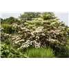 Der Japanische Blumen-Hartriegel 'Satomi'® (Cornus kousa) ist ein attraktives, sommergrünes Ziergehölz. Seine mittelgrünen, eiförmigen Blätter mit ihrem gewellten Rand geben ihm seinen einzigartigen Charakter. Im Herbst zeigen seine Blätter zudem schöne purpurrote Farben. Die Blütezeit liegt bei ihm zwischen Ende Mai und Juni. Dann trägt er rosarote Blüten. Ein Hingucker sind auch seine runden, dunkelrosafarbenen Früchte, die ab September ausgereift sind. Er entwickelt sich zu einem aufrechten Gehölz, das bis zu 6 m hoch und 5 m breit werden kann. Der Japanische Blumen-Hartriegel 'Satomi'® bevorzugt eine durchlässige, humose, kalkfreie und sandige Erde. Besonders in trockenen Zeiten solltest du auf eine ausreichende Wasserversorgung achten, sonst ist sein Wasserbedarf eher moderat. Eine sonnige bis halbschattige Lage ist optimal für dieses Laubgehölz.