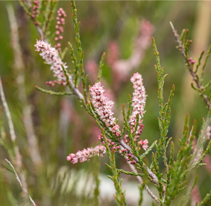 Die Kleinblütige Tamariske (Tamarix parviflora) ist ein attraktives, sommergrünes Ziergehölz. Ihre mittelgrünen, schuppenförmigen Blätter geben ihr ihren einzigartigen Charakter. Im Herbst zeigen ihre Blätter zudem schöne gelb-rote Farben. Die Blütezeit liegt bei ihr zwischen Mai und Juni. Dann trägt sie hellrosafarbene Blüten, die in Trauben angeordnet sind. Sie entwickelt sich zu einem lockeren und überhängenden Gehölz, das bis zu 5 m hoch und 3 m breit werden kann. Die Kleinblütige Tamariske bevorzugt eine durchlässige Erde. Ihr Wasserbedarf ist moderat, trotzdem ist sie ausgesprochen trockenheits- und hitzeverträglich. Eine sonnige Lage ist optimal für dieses Laubgehölz.