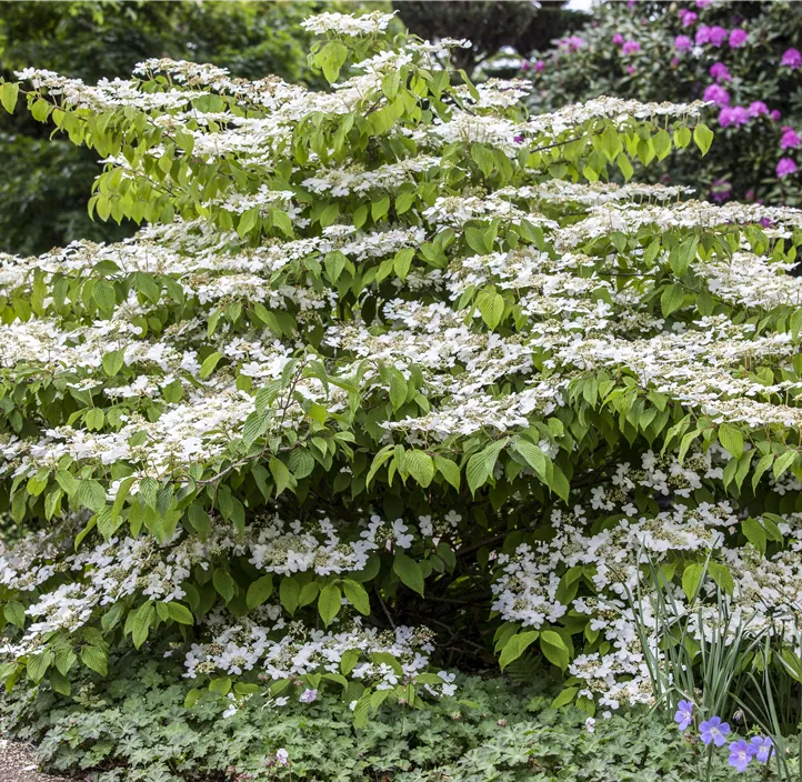 Als sommergrünes Solitärgehölz ist der Japanische Schneeball 'Mariesii' (Viburnum plicatum) besonders attraktiv. Doch auch als Ziergehölz in Kombination mit anderen Pflanzen kann er überzeugen. Sogar als Kübelpflanze kannst du ihn kultivieren. Seine mittelgrünen, eiförmigen Blätter mit ihrem gezähnten Rand geben ihm seinen einzigartigen Charakter. Im Herbst zeigen seine Blätter zudem schöne bordeauxrote bis purpurviolette Farben. Die Blütezeit liegt bei ihm zwischen Ende Mai und Juni. Dann trägt er cremeweiße Blüten, die in Trugdolden angeordnet sind. Bemerkenswert ist auch der starke Duft, der von ihnen ausgeht. Er entwickelt sich zu einem ausladenden und breiten Gehölz, das bis zu 2 m hoch und 3 m breit werden kann. Der Japanische Schneeball 'Mariesii' bevorzugt eine humose und nährstoffreiche Erde. Sein Wasserbedarf ist hoch, besonders in trockenen Zeiten solltest du daher auf eine ausreichende Wasserversorgung achten. Eine sonnige bis halbschattige Lage ist optimal für dieses Laubgehölz.