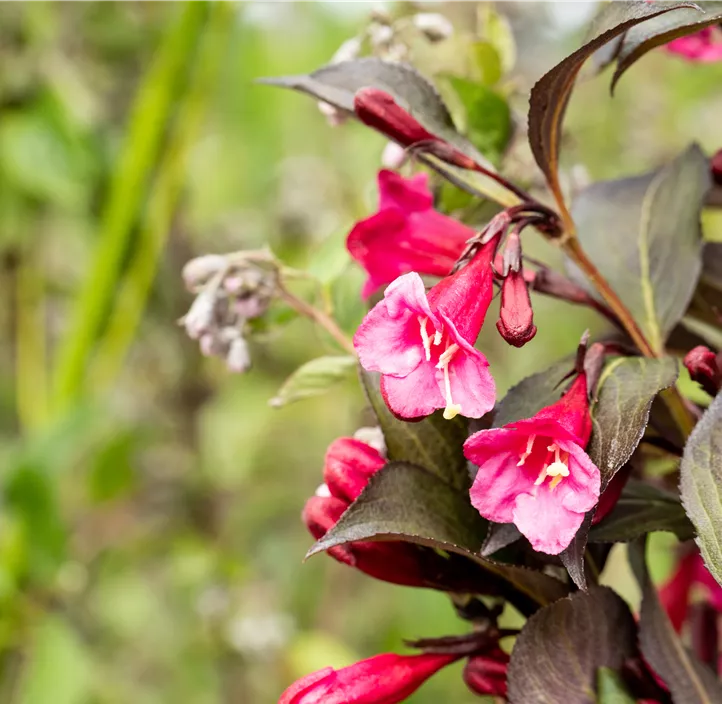 Ihre purpurroten, eiförmigen Blätter mit ihrem gesägten Rand machen sie zu einem besonders schönen Anblick. Die Blütezeit liegt bei ihr zwischen Mai und Juni. Dann trägt sie trichterförmige, dunkelrosafarbene Blüten. Sie entwickelt sich zu einem buschigen, aufrechten und dichten Gehölz, das bis zu 1,3 m hoch und 90 cm breit werden kann. Du kannst sie bei Bedarf problemlos in Form schneiden. Die Rosa Weigelie 'Alexandra'(s) bevorzugt eine durchlässige und nährstoffreiche Erde. Ihr Wasserbedarf ist hoch, besonders in trockenen Zeiten solltest du daher auf eine ausreichende Wasserversorgung achten. Eine sonnige bis halbschattige Lage ist optimal für dieses Laubgehölz, es kommt aber auch mit Schatten zurecht.