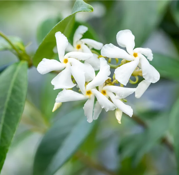Von Juni bis August erstrahlt der Sternjasmin in voller Pracht mit seinen weißen Blüten, die einen betörenden Duft verströmen. Die angenehm duftenden, dunkelgrünen Blätter runden das attraktive Erscheinungsbild dieser Pflanze perfekt ab.