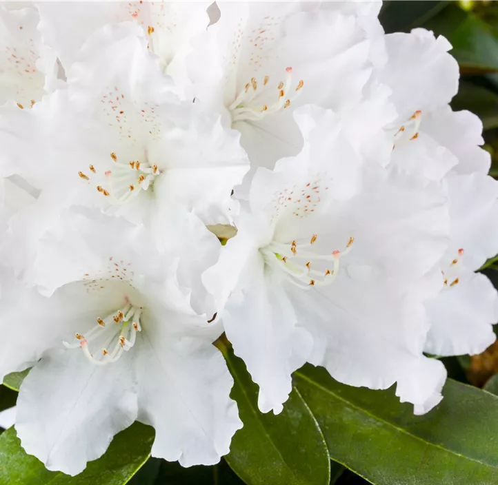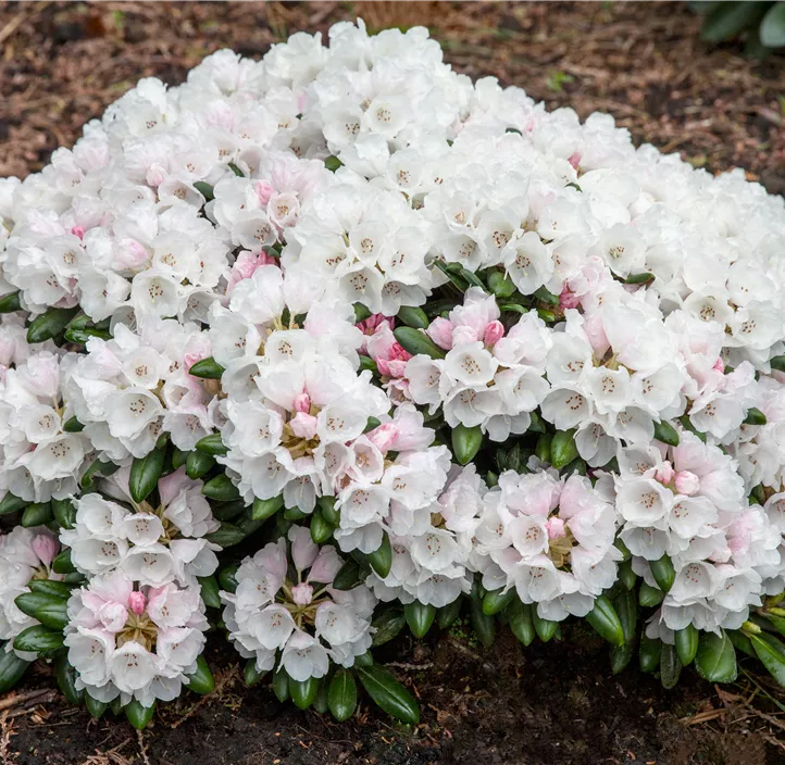 Auch außerhalb der Blütezeit ist der Yaku-Rhododendron 'Schneekrone' mit seinem dunkelgrünen Laub eine attraktive Pflanze. Als immergrüner Rhododendron sorgt er selbst im Winter für lebendige Farbakzente. Er wächst langsam und entwickelt sich im Laufe der Zeit zu einem flachen, kompakten Strauch, der bis zu 1,3 m hoch und 1,7 m breit wird. Sowohl einzeln als auch in Gruppenpflanzungen macht er eine sehr gute Figur. Er bevorzugt humose, kalkfreie Erde und benötigt eine ausreichende Wasserversorgung. Besonders in trockenen Perioden ist regelmäßiges Gießen wichtig. Ein halbschattiger bis schattiger Standort ist für ihn ideal.
