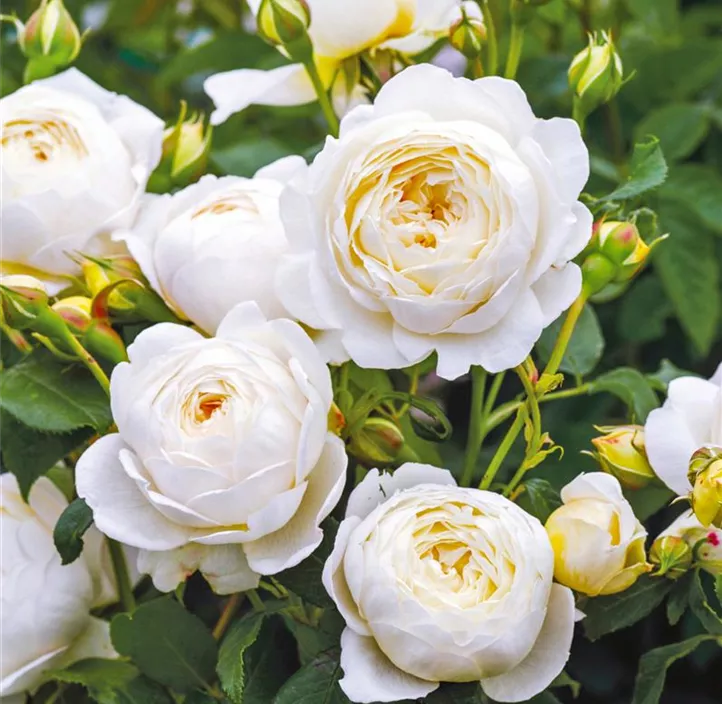 Es muss nicht gleich ein ganzer Rosengarten sein – die Strauchrose 'Claire Austin'® (Rosa) ist in jedem Garten eine charmante Bereicherung. Zwischen Juni und Oktober trägt sie ihre wunderbaren cremeweißen, gefüllten Blüten. Diese sind nicht nur optisch anziehend, ihr intensiver Blütenduft unterstreicht ihre Attraktivität zusätzlich. Ihr dunkelgrünes Laub vervollständigt die Erscheinung dieser sommergrünen Rose. Die Strauchrose 'Claire Austin'® entwickelt sich zu einem buschigen und aufrechten Gehölz, das bis zu 1,2 m hoch und 1 m breit werden kann. Durchlässige, nährstoffreiche Erde wird von ihr bevorzugt, ebenso wie eine ausreichende Wasserversorgung. Besonders in trockenen Zeiten solltest du daher regelmäßig gießen. Eine sonnige Lage ist für diese Rose optimal.