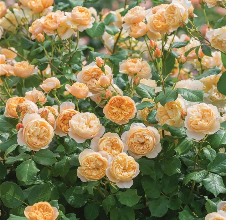 Ob im klassischen Rosengarten oder als charmante Kübelpflanze auf Balkon oder Terrasse – die Strauchrose 'Roald Dahl'® (Rosa) ist dafür bestens geeignet. Zwischen Juni und Oktober trägt sie ihre wunderbaren apricotfarbenen, starkgefüllten Blüten. Diese sind nicht nur optisch anziehend, ihr angenehmer Blütenduft unterstreicht ihre Attraktivität zusätzlich. Ihr dunkelgrünes Laub vervollständigt die Erscheinung dieser sommergrünen Rose. Die Strauchrose 'Roald Dahl'® entwickelt sich zu einem buschigen und rundlichen Gehölz, das bis zu 1,2 m hoch werden kann. Durchlässige, lockere Erde wird von ihr bevorzugt, ebenso wie eine ausreichende Wasserversorgung. Besonders in trockenen Zeiten solltest du daher regelmäßig gießen. Eine sonnige bis halbschattige Lage ist für diese Rose optimal.