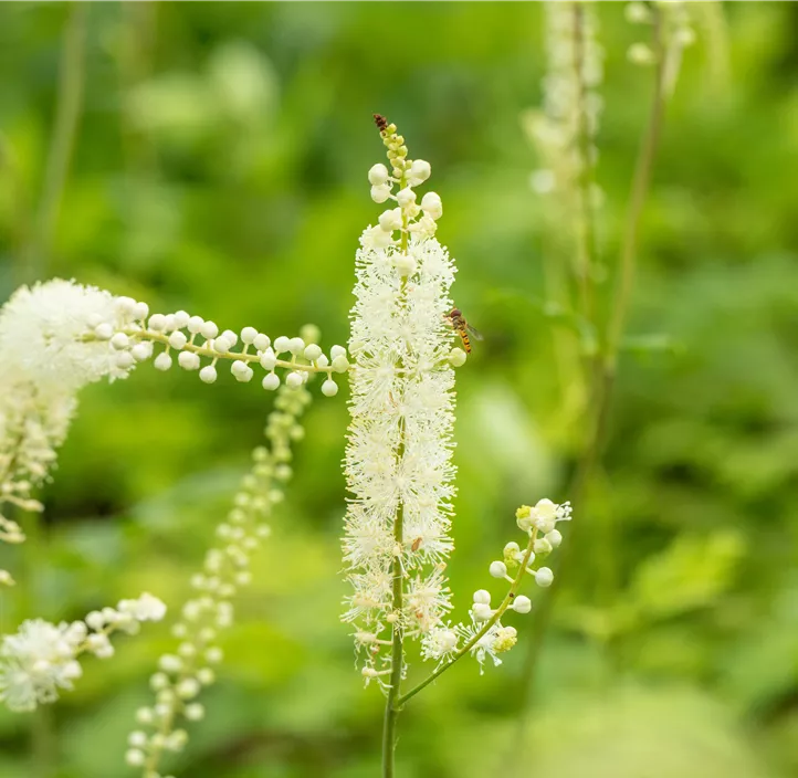 Die Juli-Silberkerze (Cimicifuga racemosa) ist eine attraktive Staude, die sich besonders gut für halbschattige bis schattige Standorte im Garten eignet, zum Beispiel in Steingärten. Besonders auffällig sind die Rispen mit cremeweißen Blüten, die von Juli bis August blühen. Ihr starker Duft ist ebenfalls bemerkenswert.