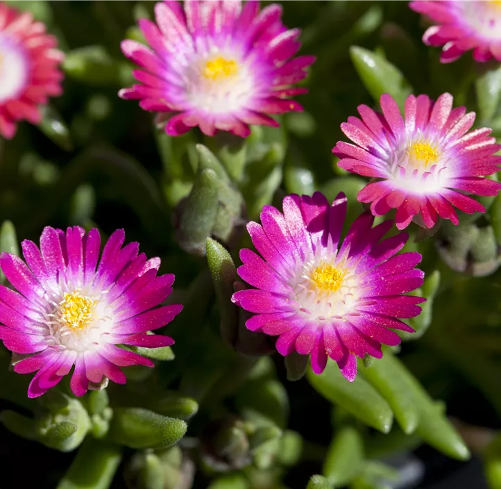 Für sonnige Standorte im Garten ist die Coopers Mittagsblume (Delosperma cooperi) eine prächtige und pflegeleichte Staude, die sowohl im Einzelstand als auch in Gruppen mit anderen Pflanzen ihre volle Wirkung entfaltet. Besonders die rosafarbenen, strahlenförmigen bis körbchenartigen Blüten, die von Juni bis Oktober blühen, machen sie zu einem echten Hingucker. Aber auch ihre dickfleischigen bis lanzettlichen, matten Blätter sind sehenswert. Mit ihrer grünen Blattfarbe bleibt die Staude auch außerhalb der Blütezeit attraktiv.