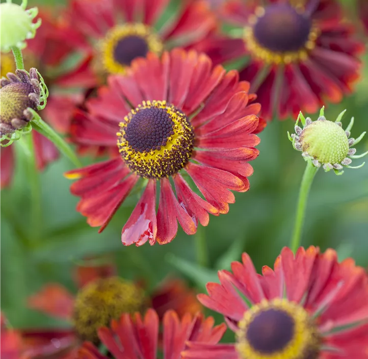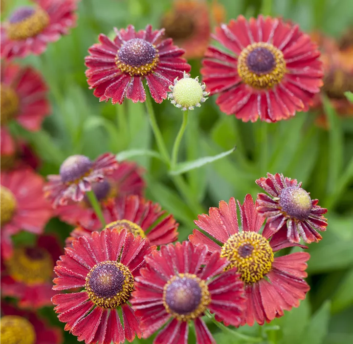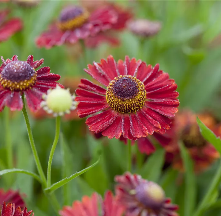 Für sonnige Standorte im Garten ist die Herbst-Sonnenbraut 'Mariachi Siesta' (Helenium autumnale) eine attraktive und pflegeleichte Staude, die sicher auch bei dir einen Platz finden wird. Es sind besonders die roten, körbchenartigen Blüten, die von Juli bis September ihren Reiz ausmachen. Doch auch ihre lanzettlichen, gezähnten Blätter können sich sehen lassen.