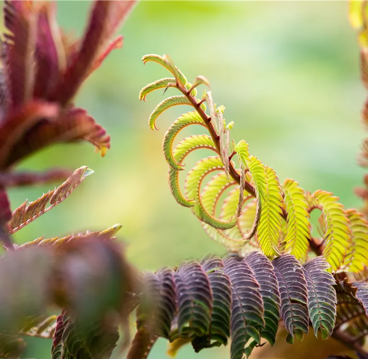 Seine rot-braunen, gefiederten Blätter machen ihn zu einem besonders schönen Anblick. Die Blütezeit liegt bei ihm zwischen Juli und August. Dann trägt er rosafarbene Blüten. Bemerkenswert ist auch der angenehme Duft, der von ihnen ausgeht. Mit 40 bis 50 cm Jahreszuwachs entwickelt er sich mit der Zeit zu einem rundlichen und aufrechten Gehölz und kann bis zu 4 m hoch und 3 m breit werden. Du kannst ihn bei Bedarf problemlos in Form schneiden. Die beste Zeit dafür ist von Februar bis März. Der Rote Seidenbaum 'Summer Chocolate'(s) bevorzugt eine durchlässige und trockene Erde und hat auch nur einen geringen Wasserbedarf. Eine sonnige bis halbschattige Lage ist optimal für dieses Laubgehölz.