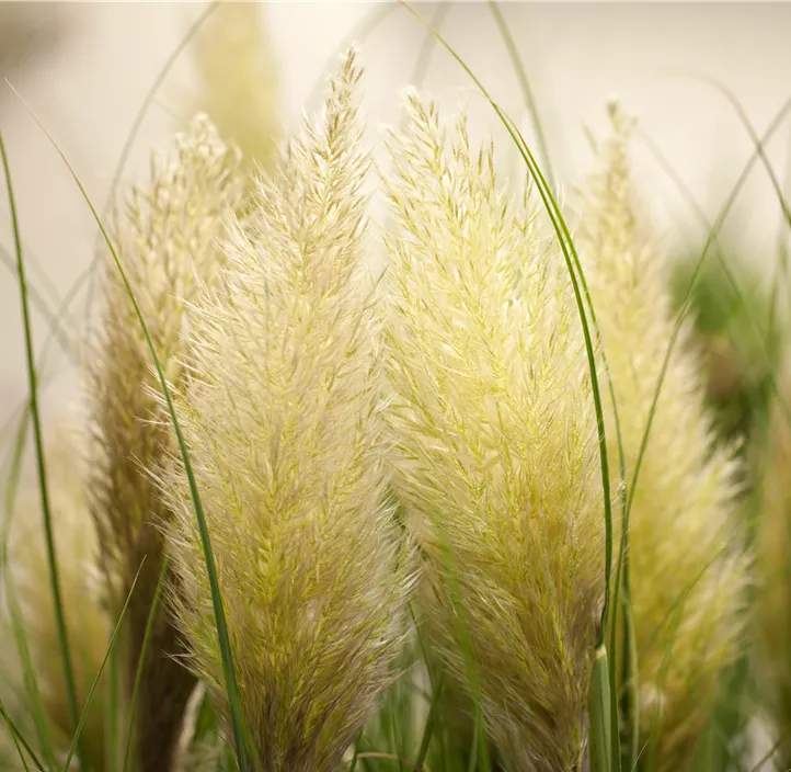 Das Garten-Pampasgras 'Evita'® (Cortaderia selloana) sorgt mit seiner Erscheinung für Begeisterung. Die grau-grünen Blätter geben diesem ausladenden Gras dabei seine Attraktivität. Selbst im Winter bietet es noch farbliche Akzente, da es seine Blätter behält. Von August bis Oktober trägt das Garten-Pampasgras 'Evita'® hellgelbe Blütenrispen, die für sich ein faszinierender Anblick sind. Bei einer Wuchshöhe von etwa 1,5 m und einer Breite von 1 m kommt dieses Gras besonders gut als Solitär im Garten zur Geltung, du kannst es aber auch mit anderen Pflanzen, z.B. Rose und Wacholder, kombinieren. Das Garten-Pampasgras 'Evita'® bevorzugt durchlässige, humose und nährstoffreiche Erde und hat einen moderaten Wasserbedarf. Besonders in trockenen Zeiten solltest du dennoch ausreichend gießen. Für einen gesunden Wuchs ist für dieses Gras auch ein sonniger Standort von Vorteil. Temperaturen um -16°C werden von ihm problemlos vertragen, dennoch solltest du für einen Winterschutz sorgen. Dafür kannst du z.B. eine Schicht Laub um die Pflanze geben.