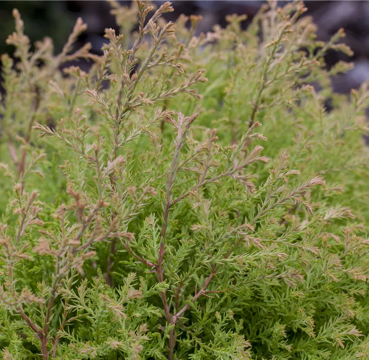Seine schuppenförmigen Nadeln machen ihn dabei zu einem schönen Anblick. Der rote Austrieb färbt sich zum Sommer dunkelgrün. Im Winter wiederum zeigen die Nadeln bronzefarbene Farben. Ab Oktober sind zudem seine braunen Zapfen ausgereift. Mit 25 bis 30 cm Jahreszuwachs entwickelt er sich zu einem dichten und kompakten Gehölz, das bis zu 3 m hoch und 1,5 m breit werden kann. Du kannst ihn bei Bedarf problemlos in Form schneiden. Die beste Zeit dafür ist von Ende Juni bis Juli. Der Lebensbaum 'Fire Chief' erweist sich als sehr pflegeleicht und bevorzugt eine kalkhaltige, nährstoffreiche, sandige und lehmige Erde. Sein Wasserbedarf ist moderat, besonders in trockenen Zeiten solltest du jedoch auf eine ausreichende Wasserversorgung achten. Eine sonnige bis halbschattige Lage ist optimal für diese Konifere. Bitte beachte beim Umgang mit dieser Pflanze, dass sie giftig ist.