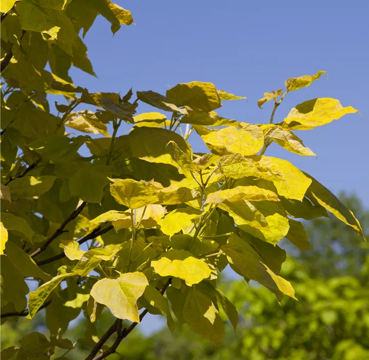 Ihre grüngelben, herzförmigen Blätter geben ihr ihren einzigartigen Charakter. Ihr Blattaustrieb ist dabei noch auffällig goldgelb. Im Herbst zeigen ihre Blätter zudem schöne gelbe Farben. Die Blütezeit liegt bei ihr zwischen Juni und Juli. Dann trägt sie cremeweiße Blüten, die in Rispen angeordnet sind. Mit 30 bis 35 cm Jahreszuwachs entwickelt sie sich mit der Zeit zu einem rundlichen Gehölz und kann bis zu 8 m hoch und 8 m breit werden. Der reichfruchtende Trompetenbaum 'Aurea' bevorzugt eine durchlässige und nährstoffreiche Erde. Besonders in trockenen Zeiten solltest du auf eine ausreichende Wasserversorgung achten, sonst ist ihr Wasserbedarf eher moderat. Eine sonnige bis halbschattige, windgeschützte Lage ist optimal für dieses Laubgehölz.