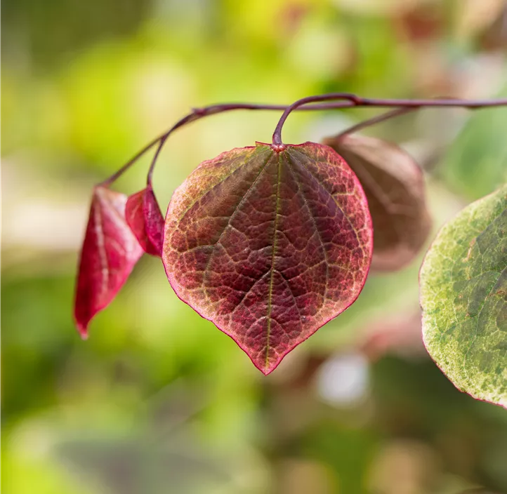 Als sommergrünes Solitärgehölz ist der Judasbaum 'Carolina Sweetheart' (Cercis canadensis) besonders attraktiv. Doch auch als Ziergehölz in Kombination mit anderen Pflanzen kann er überzeugen. Seine dunkelgrünen, herzförmigen Blätter mit ihrem weißen Rand machen ihn zu einem besonders schönen Anblick. Sein Blattaustrieb ist dabei noch auffällig purpurrot. Die Blütezeit liegt bei ihm zwischen April und Mai. Dann trägt er schmetterlingsförmige, karminrote Blüten. Er entwickelt sich zu einem ausladenden und malerischen Gehölz, das bis zu 10 m hoch und 8 m breit werden kann. Der Judasbaum 'Carolina Sweetheart' bevorzugt eine durchlässige und kalkhaltige Erde. Sein Wasserbedarf ist moderat, trotzdem ist er ausgesprochen trockenheits- und hitzeverträglich. Eine sonnige Lage ist optimal für dieses Laubgehölz.