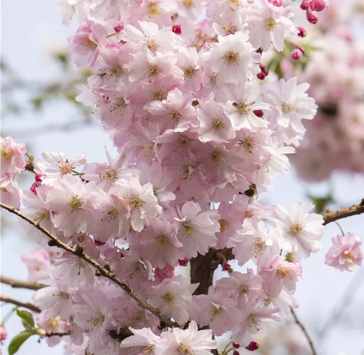 Ihre mittelgrünen, eiförmigen Blätter mit ihrem gesägten Rand geben der Rosa Winterkirsche 'Autumnalis Rosea' ihren einzigartigen Charakter. Im Herbst zeigen ihre Blätter zudem schöne gelb-orangene Farben. Die Blütezeit liegt bei ihr zwischen März und April. Dann trägt sie schalenförmige, hellrosafarbene Blüten. Sie entwickelt sich zu einem aufrechten und überhängenden Gehölz, das bis zu 5 m hoch und 5 m breit werden kann. Die Rosa Winterkirsche 'Autumnalis Rosea' bevorzugt eine durchlässige, humose und kalkhaltige Erde. Besonders in trockenen Zeiten solltest du auf eine ausreichende Wasserversorgung achten, sonst ist ihr Wasserbedarf eher moderat. Eine sonnige Lage ist optimal für dieses Laubgehölz.