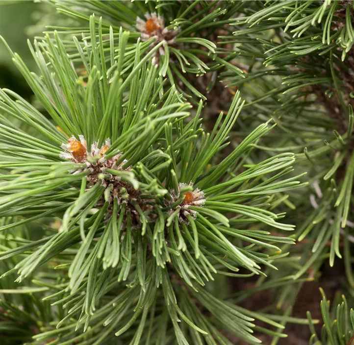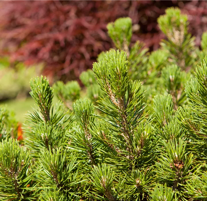 Als attraktives, immergrünes Solitärgehölz, zum Beispiel in Steingärten, ist die Kugel-Kiefer 'Mops' (Pinus mugo) eine gute Wahl. Sogar als Kübelpflanze kannst du sie kultivieren. Ihre Nadeln machen sie dabei zu einem schönen Anblick. Diese haben eine mittelgrüne Farbe. Ab Oktober sind zudem ihre kegelförmigen, braun-gelben Zapfen ausgereift. Mit 5 bis 10 cm Jahreszuwachs entwickelt sie sich mit der Zeit zu einem dichten und kugelförmigen Gehölz und kann bis zu 2 m hoch und 1 m breit werden. Die Kugel-Kiefer 'Mops' erweist sich als sehr pflegeleicht und stellt kaum Ansprüche an die Erde, in der sie wächst. Ihr Wasserbedarf ist moderat, besonders in trockenen Zeiten solltest du jedoch auf eine ausreichende Wasserversorgung achten. Eine sonnige bis halbschattige Lage ist optimal für diese Konifere.