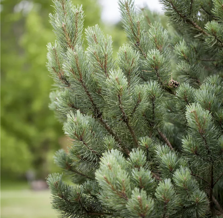Als attraktives, immergrünes Solitärgehölz ist die Silberkiefer 'Watereri' (Pinus sylvestris) eine gute Wahl. Ihre gedrehten Nadeln machen sie dabei zu einem schönen Anblick. Diese haben eine blau-graue Farbe. Mit 10 bis 12 cm Jahreszuwachs entwickelt sie sich mit der Zeit zu einem breiten Gehölz und kann bis zu 5 m hoch und 6 m breit werden. Die Silberkiefer 'Watereri' stellt kaum Ansprüche an die Erde, in der sie wächst. Ihr Wasserbedarf ist moderat, trotzdem ist sie ausgesprochen trockenheits- und hitzeverträglich. Eine sonnige Lage ist optimal für diese Konifere.