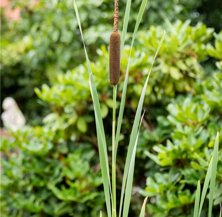 Teichufer oder Plätze in Wassernähe werden mit dem Breitblättrigen Rohrkolben (Typha latifolia) noch etwas attraktiver. Bereits seine länglichen Blätter sind mit ihrer dunkelgrünen Farbe ein interessanter Anblick. Auch im Herbst ist er damit ein Blickfang, da sich seine Blätter dann orangegelb färben. Von Juli bis August sind es seine braunen Blüten, die für Abwechslung sorgen. Besonders für sonnige Bereiche ist er eine gute Wahl. Dort kann diese Wasserpflanze ihren aufrechten, ausläuferbildenden Wuchs am besten entfalten und sich so zu Größen von bis zu 2,5 m Höhe und 80 cm Breite entwickeln. Wassertiefen bis zu 50 cm werden von ihm vertragen, wichtig ist dabei jedoch eine humose und nährstoffreiche Erde. Alles in allem erweist sich der Breitblättrige Rohrkolben als sehr pflegeleichte Pflanze, an der du lange deine Freude haben wirst.