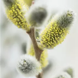Die Blütezeit der Hängenden Kätzchenweide 'Pendula' liegt zwischen März und April. Dann trägt sie silbrige Blüten, die in Kätzchen angeordnet sind und einen leichten, angenehmen Duft verströmen. Mit einem Jahreszuwachs von 0,4 bis 1 Meter entwickelt sie sich zu einem überhängenden Gehölz, das bis zu 1,5 Meter hoch und 1 Meter breit werden kann. Bei Bedarf lässt sie sich problemlos in Form schneiden, wobei die beste Zeit dafür im Mai ist. Die Hängende Kätzchenweide 'Pendula' ist sehr pflegeleicht und bevorzugt durchlässige sowie feuchte bis nasse Erde. Ihr Wasserbedarf ist hoch, weshalb besonders in trockenen Zeiten auf eine ausreichende Wasserversorgung geachtet werden sollte. Ein sonniger bis halbschattiger Standort ist optimal für dieses Laubgehölz.