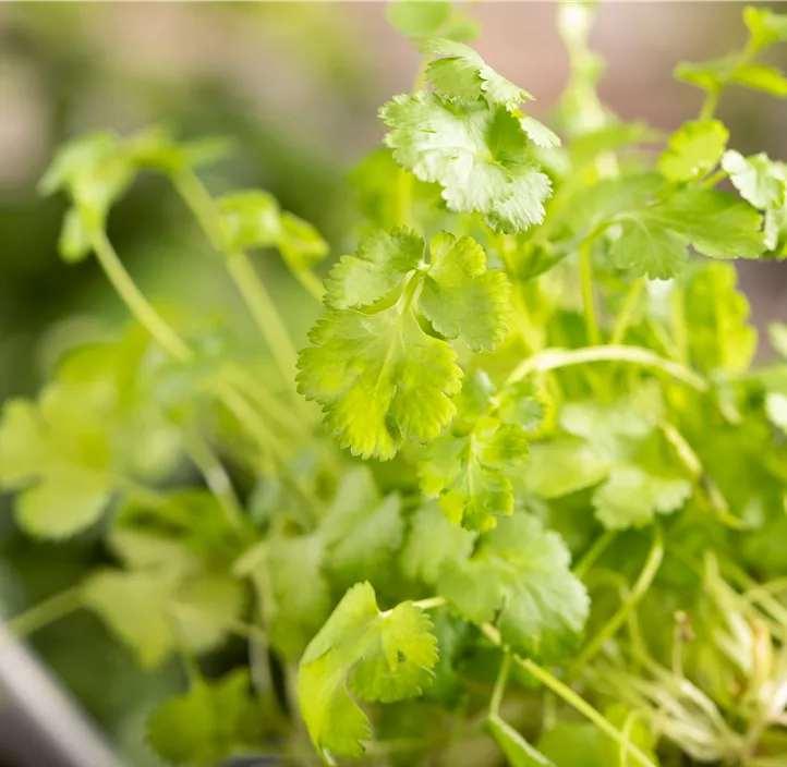 Den Koriander (Coriandrum sativum) im eigenen Garten zu kultivieren ist immer eine gute Idee. So hast du seine mittelgrünen, würzigen Blätter frisch zur Verfügung. Die beste Zeit für die Ernte ist dabei von Juni bis Oktober. Er kann vielseitig verwendet werden. Selbst wohltuende Tees können aus den Blättern zubereitet werden. Von Juni bis Juli trägt er zudem weiße Blüten. Damit sich der Koriander gut entwickeln kann, solltest du ihn in durchlässige, humose und nährstoffreiche Erde pflanzen und besonders in trockenen Zeiten regelmäßig gießen. Ebenso ist ein sonniger bis halbschattiger Standort optimal. Für die Wahl des Standortes solltest du auch die Wuchseigenschaften beachten: Etwa 60 cm Höhe bei 30 cm Breite kann diese Kräuterpflanze erreichen.