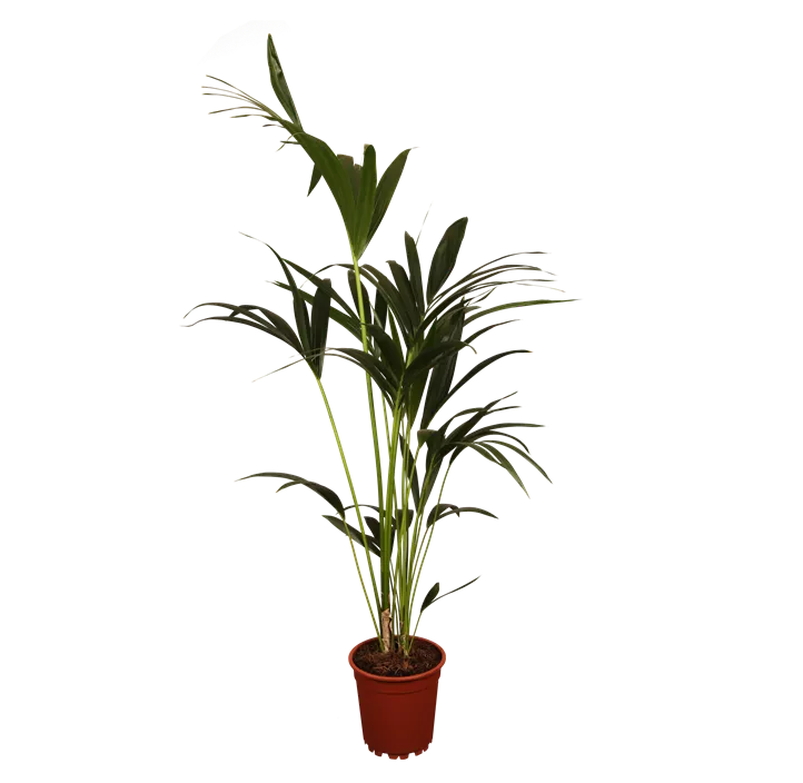 Die tief geschlitzten Blätter der Kentiapalme (Howea forsteriana) stehen für natürliche Lebendigkeit. Ihre dunkelgrüne Farbe setzt dabei farbliche Akzente. Mit ihrem aufrechten Wuchs macht sie eine gute Figur und wird etwa 3 m hoch sowie etwa 1,5 m breit. So faszinierend die Kentiapalme auch ist, so ist sie doch eine sehr pflegeleichte Zimmerpflanze. Ein halbschattiger Standort ist optimal. Ebenso bevorzugt sie eine durchlässige und schwachsaure Erde. Ihr Wasserbedarf ist moderat, das heißt, die Erde darf auch schon mal antrocknen, bevor du wieder gießt. Überschüssiges Wasser muss jedoch gut abfließen können, da es sonst zu Staunässe kommen kann und die Wurzeln in Mitleidenschaft gezogen werden.