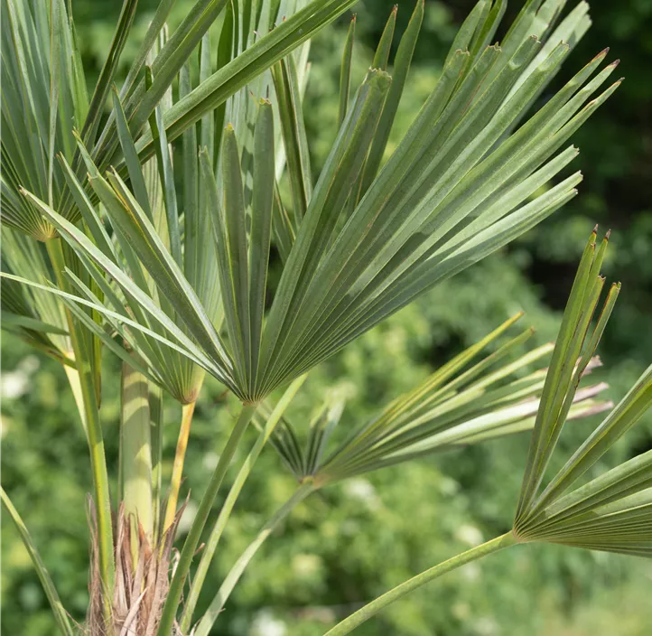 Die Hanfpalme (Trachycarpus fortunei) bringt exotisches Flair in deinen Garten und bereichert ebenso als immergrüne Kübelpflanze Balkon, Terrasse oder Wintergarten. Sie ist pflegeleicht, sodass du kaum etwas falsch machen kannst. Die grünen Blüten, die sie trägt, machen sie zu einer echten Attraktion. Ihre dunkelgrünen Blätter unterstreichen ihre Wirkung zusätzlich. Mit ihrem aufrechten Wuchs erreicht die Hanfpalme Wuchshöhen von etwa 4 m und Breiten von etwa 3 m. Für eine gesunde Entwicklung benötigt sie durchlässige, nährstoffreiche und schwachsaure Erde, einen sonnigen, windgeschützten Standort sowie eine ausreichende Wasserversorgung. Achte darauf, dass der Wurzelbereich nicht austrocknet, aber auch keine Staunässe entsteht. Sie verträgt Temperaturen bis -16 °C und gilt somit als frosthart. Besonders in exponierten Lagen empfiehlt sich dennoch ein Winterschutz.