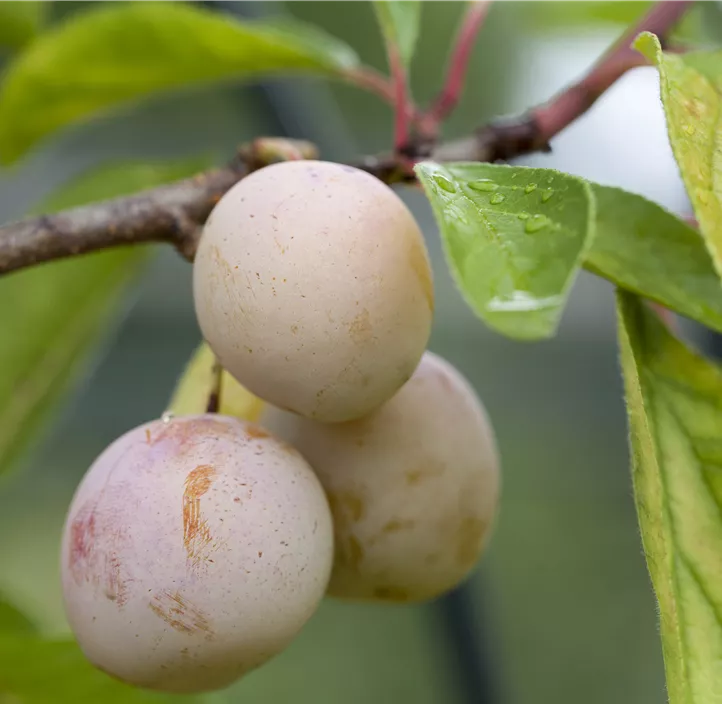Von August bis September ist Erntezeit: Die Mirabelle (Prunus domestica) ist reif und du kannst direkt im eigenen Garten ernten! Die Kultur ist gar nicht schwer. Ihre orangegelben Früchte haben einen süß-säuerlichen Geschmack. Du kannst sie roh verzehren, sie lassen sich aber auch zu vielen Köstlichkeiten, wie zum Beispiel Kuchen, verarbeiten. Auch leckere Konfitüren können daraus zubereitet werden. Doch ohne ihre weißen Blüten gibt es auch bei der Mirabelle keine Früchte. Ihre Blütezeit liegt zwischen März und April. Damit sie sich gut entwickelt, solltest du sie in durchlässige, humose Erde an einem sonnigen bis halbschattigen Standort pflanzen. Auch eine ausreichende und regelmäßige Wasserversorgung ist unerlässlich. Mit ihrem aufrechten und schlanken Wuchs kann sie etwa 6 bis 10 m hoch und 2 bis 5 m breit werden. Jedoch hängen die Wuchseigenschaften bei Obstgehölzen stark von der verwendeten Unterlage ab, sodass Abweichungen möglich sind.