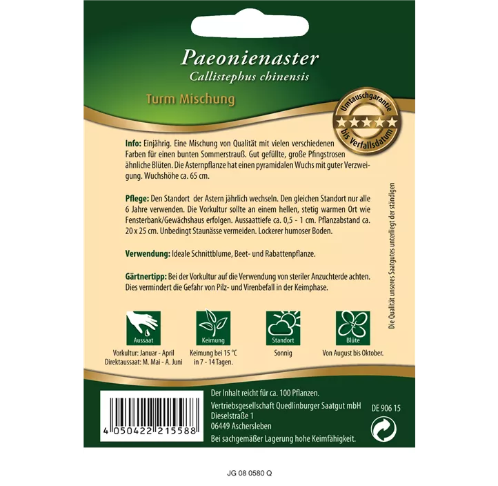 Die Astern Paeonien-Turm Mischung punktet mit einer hohen Keimfähigkeit und einfachem Pflegeaufwand. Mit ein wenig Liebe gedeihen sie prächtig und bescheren dir eine leuchtende und blühende Pracht vom Frühsommer bis zum ersten Frost. Sie sind robust, gedeihen in nahezu jeder Bodenart und vertragen auch sommerliche Hitzeperioden problemlos. Mach dir also keine Sorgen, wenn du mal keine grünen Daumen fühlst – diese Blumen sind pflegeleicht und geduldig.