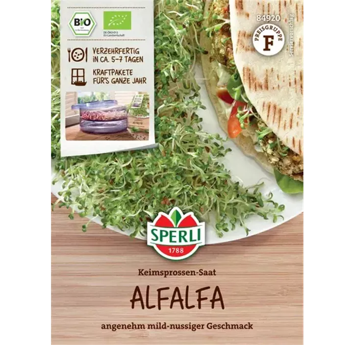 Für alle Fans von Keimsprossen und Microgreens gibt es etwas Frisches und Gesundes, direkt aus dem Hause Sperli: Die BIO Keimsprossen Alfalfa! Dank der präzisen Anleitung auf der Packung handelt es sich um ein wirklich praktisches Produkt, das alle Hobbygärtner lieben werden. Mit etwas Wasser, einem halbschattigen Standort und etwas Aufmerksamkeit, gelingen die Alfalfa Sprossen in kürzester Zeit. Es ist so einfach! Und die frischen grünen Sprossen sehen nicht nur toll aus, sie bringen auch einen köstlichen, nussigen Geschmack auf den Teller.