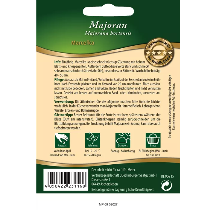 Und das ist noch nicht alles: sie ist nicht nur essbar, sondern auch in der Lage, ausreichend Wasser zu speichern - das heißt, sie zieht einen mittleren Wasserhaushalt vor, was sie zur idealen Pflanze für diejenigen macht, die keine "Wasserliebhaber" sind. Die Marke Quedlinburger steht für Qualität und daher kann man sich sicher sein, mit der Majoran Marcelka eine ausgezeichnete Wahl getroffen zu haben. Also, warum nicht diese ansprechende und multifunktionale Pflanze in den Garten, auf den Balkon oder die Terrasse holen?
