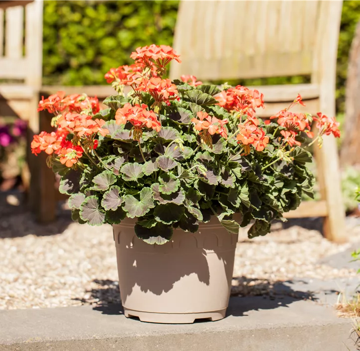 Durch ihren buschigen und aufrechten Wuchs sind bei dieser Pflanze Wuchshöhe von etwa 50 cm und Breiten von etwa 60 cm möglich. Du brauchst gar nicht viel tun, damit die Zonal-Pelargonie 'Brocade' sich gut entwickelt. Sie braucht nur eine durchlässige und nährstoffreiche Erde sowie einen sonnigen bis halbschattigen, windgeschützten Standort und eine ausreichende Wasserversorgung. Das heißt, du solltest so gießen, dass der Wurzelbereich nicht austrocknet, aber auch keine Staunässe entsteht.