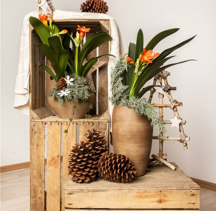 Für etwas exotischen Flair auf Balkon, Terrasse oder in deinem Wintergarten sorgt die Zimmer-Clivie (Clivia miniata) als immergrüne Kübelpflanze im Handumdrehen. Die Dolden aus mehrfarbigen, trichterförmigen Blüten, die sie von Februar bis März trägt, machen aus ihr eine Attraktion. Ihre Blätter unterstreichen ihre Wirkung zusätzlich mit ihrer schönen, gestreiften Farbe. Durch ihren rosettenartigen Wuchs sind bei dieser Pflanze Wuchshöhen von etwa 60 cm und Breiten von etwa 60 cm möglich. Um sich gut zu entwickeln, braucht die Zimmer-Clivie nur eine durchlässige und nährstoffreiche Erde, sowie einen sonnigen bis halbschattigen Standort und eine ausreichende Wasserversorgung. Das heißt, du solltest so gießen, dass der Wurzelbereich nicht austrocknet, aber auch keine Staunässe entsteht.