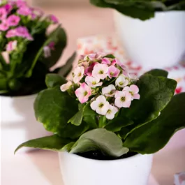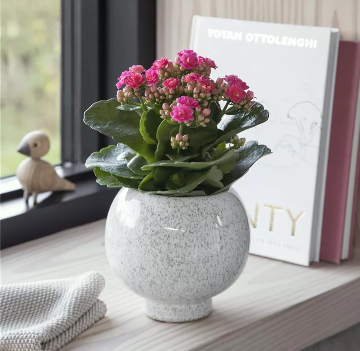 Die sternförmigen Blüten des Flammenden Käthchens (Kalanchoe blossfeldiana) setzen rote, weiße oder rosafarbene Akzente und sorgen so für natürliche Lebendigkeit. Auch die dickfleischigen Blätter tragen ihren Teil dazu bei. Mit seinem kompakten Wuchs macht es eine gute Figur und wird etwa 30 cm hoch sowie rund 20 cm breit. So faszinierend das Flammende Käthchen auch ist, so ist es doch eine sehr pflegeleichte Zimmerpflanze. Du solltest lediglich beachten, dass es kein direktes Sonnenlicht verträgt. Milde Morgen- oder Abendsonne sind noch in Ordnung, am besten ist aber indirektes Licht. Ebenso bevorzugt es eine durchlässige und humose Erde. Sein Wasserbedarf ist moderat, das heißt, die Erde darf auch schon mal antrocknen, bevor du wieder gießt. Überschüssiges Wasser muss jedoch gut abfließen können, da es sonst zu Staunässe kommen kann und die Wurzeln in Mitleidenschaft gezogen werden.