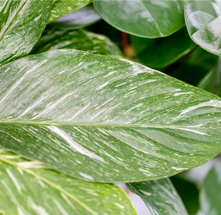 Die lanzettlichen Blätter des Einblatts 'Diamond' (Spathiphyllum floribundum) stehen für natürliche Lebendigkeit. Ihre grün-weiße Farbe setzt dabei farbliche Akzente. Ganz nebenbei wirken sie sich auch noch positiv auf die Umgebung aus, da sie in der Lage sind, Schadstoffe aus der Raumluft zu filtern. Und auch die weißen Blüten sind ein Hingucker. Mit seinem buschigen und aufrechten Wuchs macht es eine gute Figur, dabei wird es etwa 60 cm hoch und etwa 60 cm breit. Um die Faszination des Einblatts 'Diamond' genießen zu können, solltest du ihm einen halbschattigen bis schattigen Standort geben, an dem es nicht zieht. Ebenso bevorzugt es eine durchlässige und nährstoffreiche Erde. Sein Wasserbedarf ist moderat, das heißt, die Erde darf auch schon mal antrocknen, bevor du wieder gießt. Überschüssiges Wasser muss jedoch gut abfließen können, da es sonst zu Staunässe kommen kann und die Wurzeln in Mitleidenschaft gezogen werden.