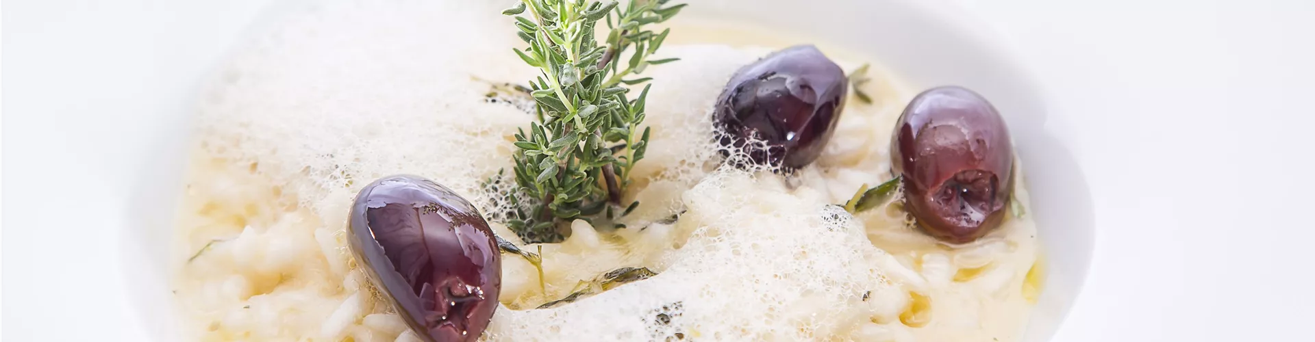 Zwiebel schälen und fein würfeln, in Olivenöl glasig anlaufen lassen, Reis und einige Zweige Thymian beigeben und kurz mitrösten. Mit Weißwein ablöschen und einreduzieren lassen. Mit der Suppe aufgießen und ständig rühren, der Reis soll bissfest sein, seine Konsistenz leicht cremig.