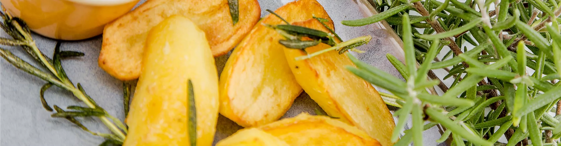 Nach der halben Backzeit Kartoffelscheiben wenden und den grob gehackten Rosmarin beigeben. Wenn Sie knusprig genug sind, auf Küchenpapier abfetten und servieren!