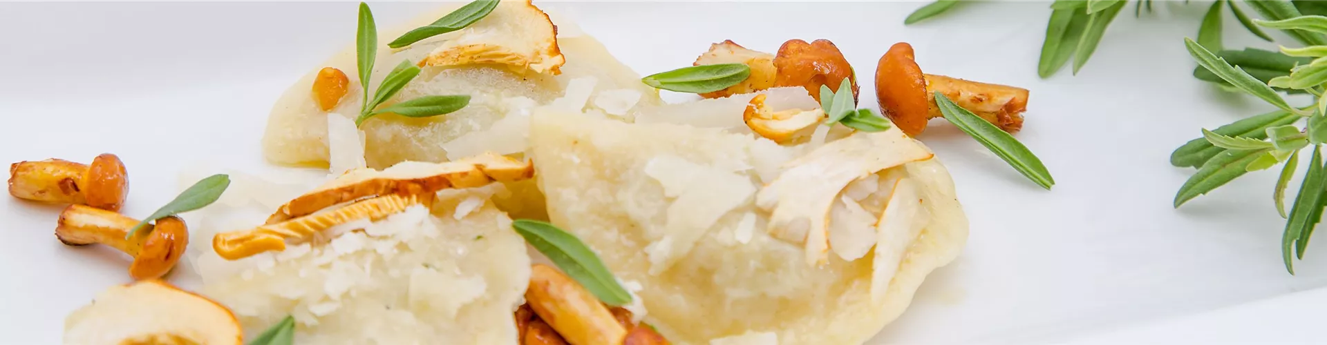 Für den Nudelteig alle Zutaten gut verkneten und rasten lassen. Für die Fülle: Olivenöl erhitzen und die gewürfelten Schalotten mit den geschnittenen Eierschwammerl ansautieren, salzen und eventuell abtropfen lassen. Topfen, gepresste gekochte Erdäpfel, geschnittenen Majoran und Petersilie beigeben, mit Salz, Pfeffer und Muskat abschmecken.