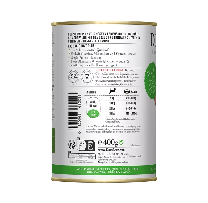Wenn du auf der Suche nach einem hochwertigen Alleinfutter für deinen vierbeinigen Liebling bist, dann ist "Dog's Love Dose Adult Wild" genau das Richtige. Es handelt sich um ein delikates Nassfutter, mit monoprotein Zusammensetzung, was es besonders gut verträglich macht. Ideal für die Lebensphase "Adult", kann es sowohl allein, als auch als Ergänzung zur bestehenden Ernährung dienen.