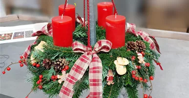 Du möchtest deinen Adventkranz lieber von uns binden lassen? Das machen wir gerne! Stell einfach die gewünschten Materialen zusammen und frag direkt vor Ort in deiner Filiale nach.